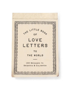 "The Little Book of Love Letters to the World" is the perfect present for anyone! Each of the 150 pages contains a reminder to brighten and enlighten. Post them on a fridge, put one in a lunchbox, or mail it to a friend. The possibilities are endless! Details: Dimensions: 4" x 5.75" (150 pages) A note from the artist: Dear reader, Each page of this little book is perforated so you can easily tear them out to share. Included are 150 love letters to scatter into the world for our fellow members of humanity. Your mission, should you choose to accept it, is to use your imagination by finding opportunities to brighten and enlighten someone's day. How do you do that you say? You can leave a page from this book on a windshield or in a cornfield. Tuck under your bar tab or leave in a cab. Put on a bench or use as a thank you note in a pinch. Tack to a tree or anywhere you see. Feel free to make a little glee along your journey. Xo, Sugarboo & Co.