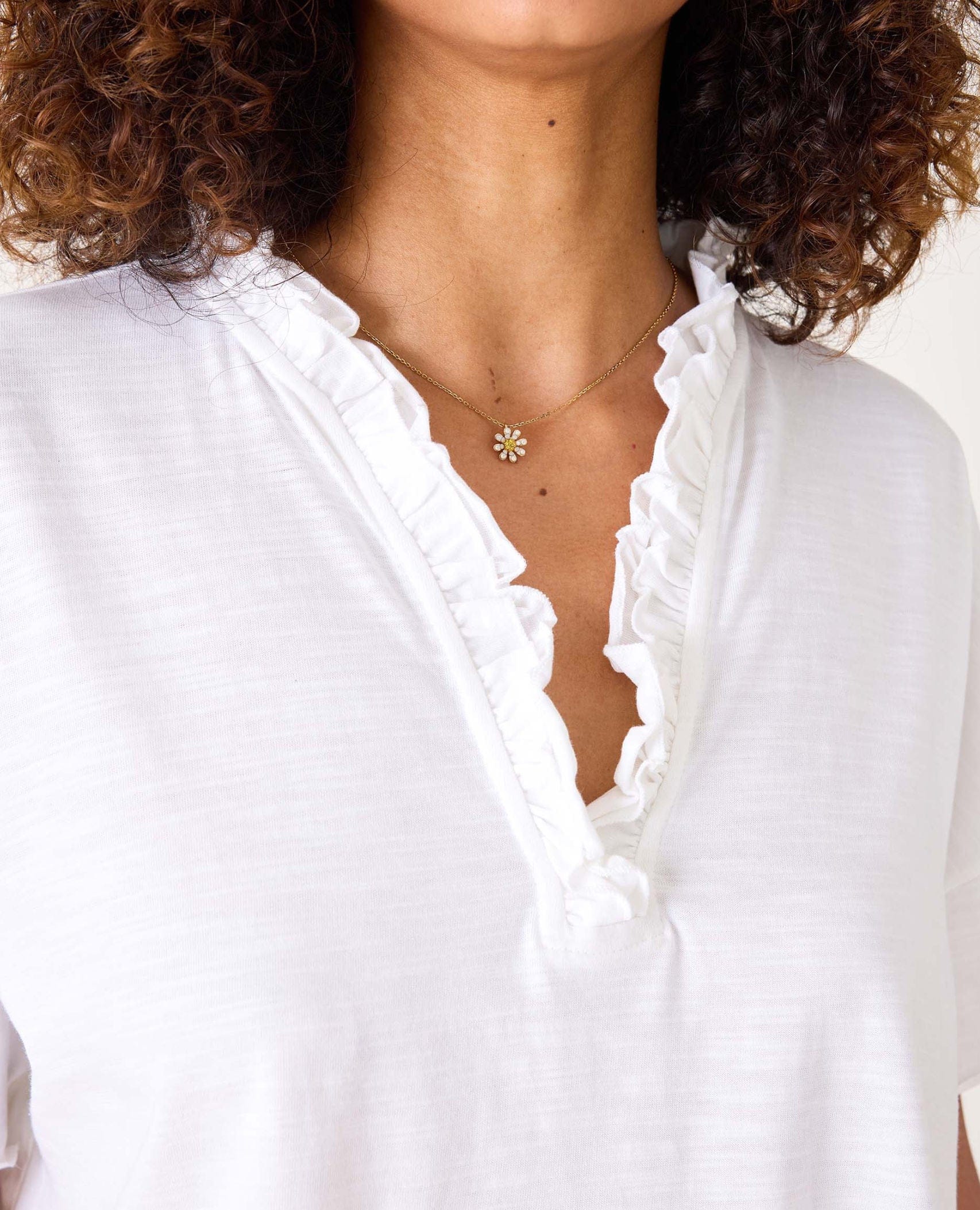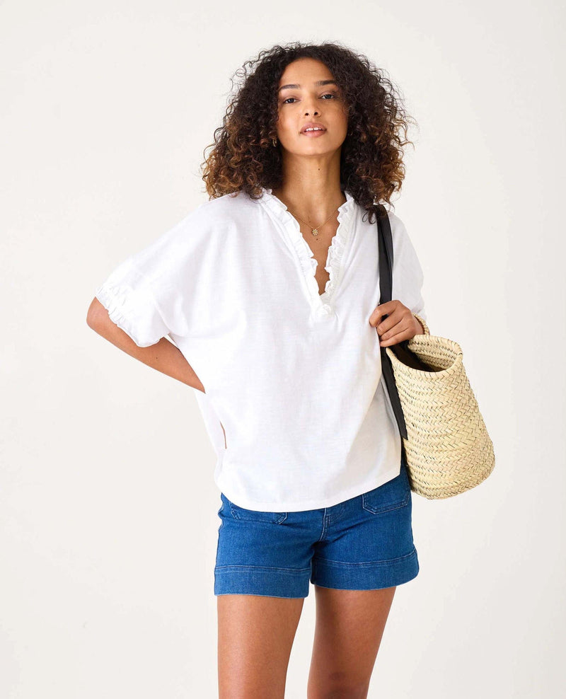 This tee does the styling for you. Pair it with denim and sandals for an elevated everyday look, or tuck it into a skirt or tailored pant when you want something simple but polished. It layers beautifully under jackets without losing the ruffle moment.