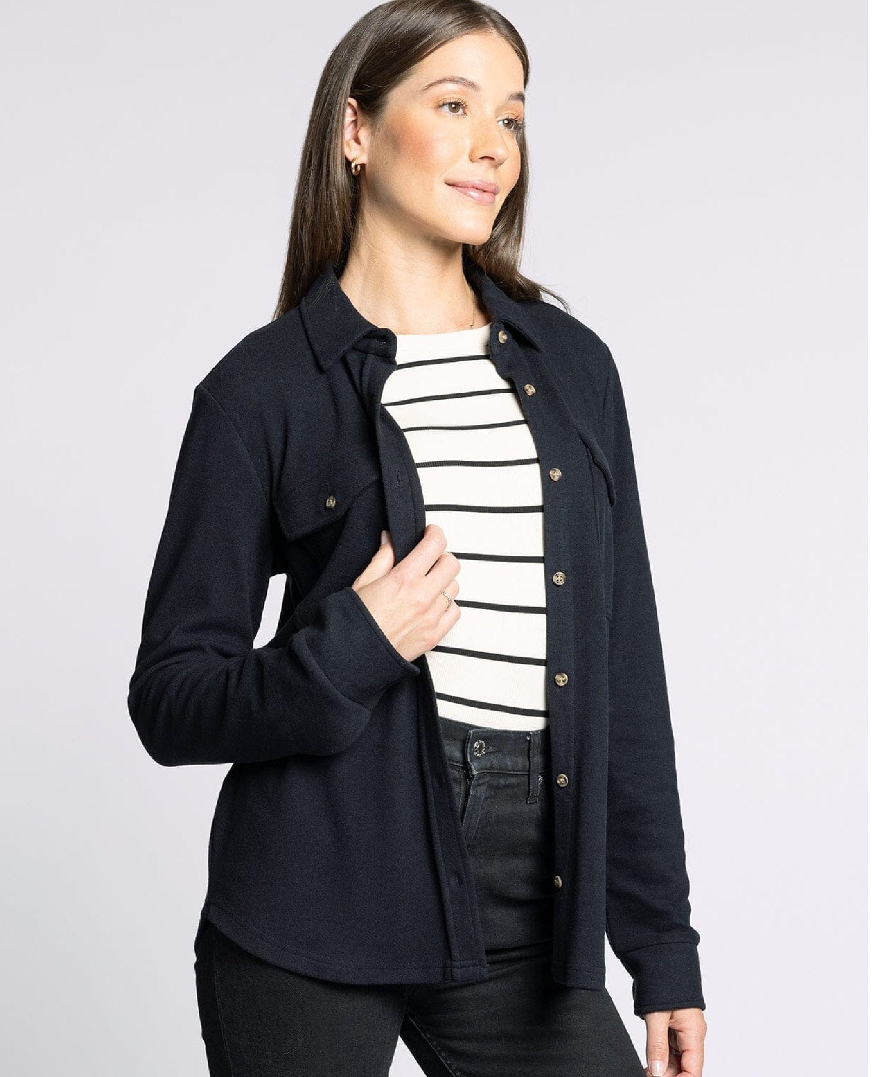 Wear it open over a white or charcoal tank for clean contrast and effortless layering