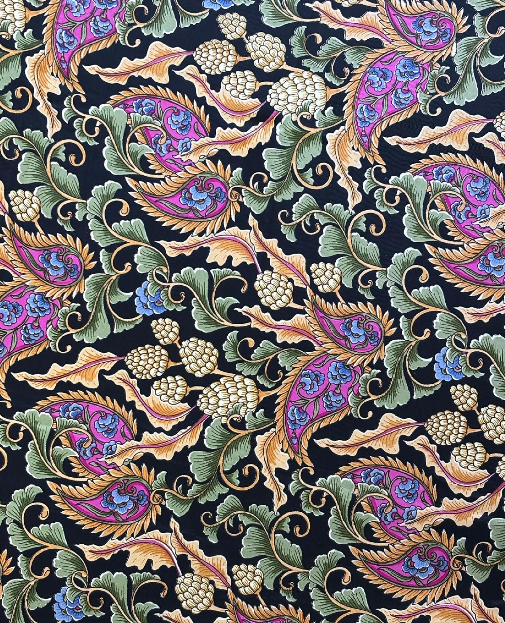 This dress features a beautiful blend of sage green, gold, tan with touch of purple and fuchsia accents—very romantic and vintage-inspired.