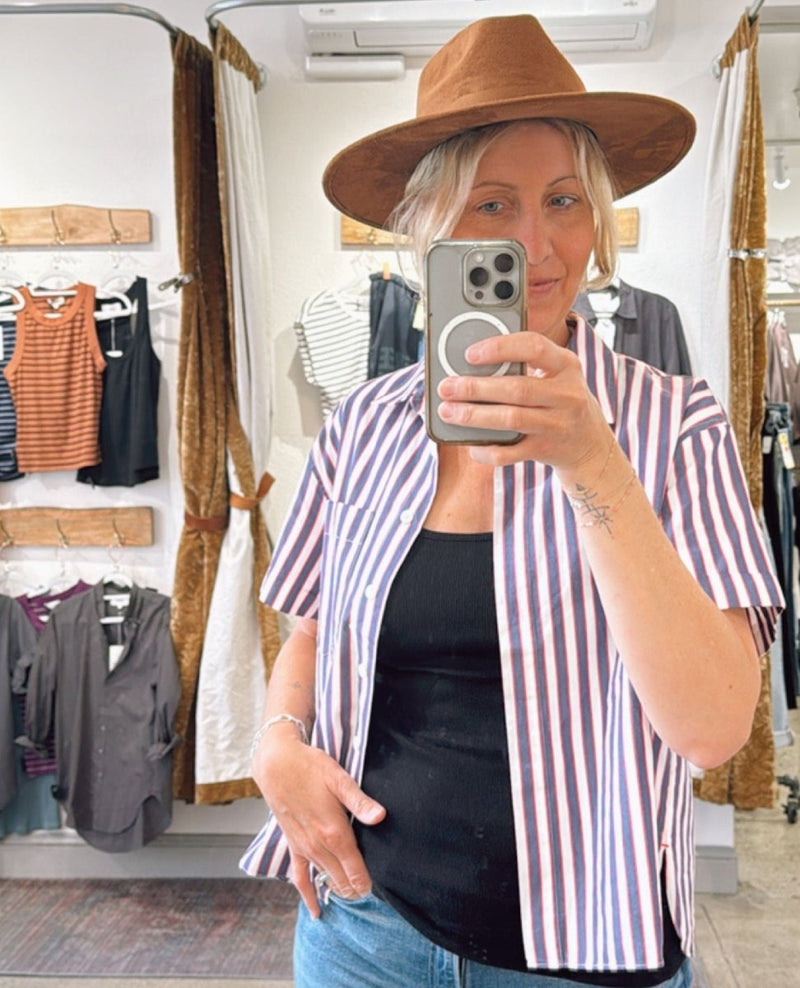 A fresh take on a classic staple. The Drake is crafted from our new crisp, multicolor striped cotton for a look that’s both polished and playful. This button-front shirt features a clean hidden placket, rolled sleeves, a left chest patch pocket, and a flattering high-low shirttail hem. Effortlessly versatile—perfect for workdays or weekends.