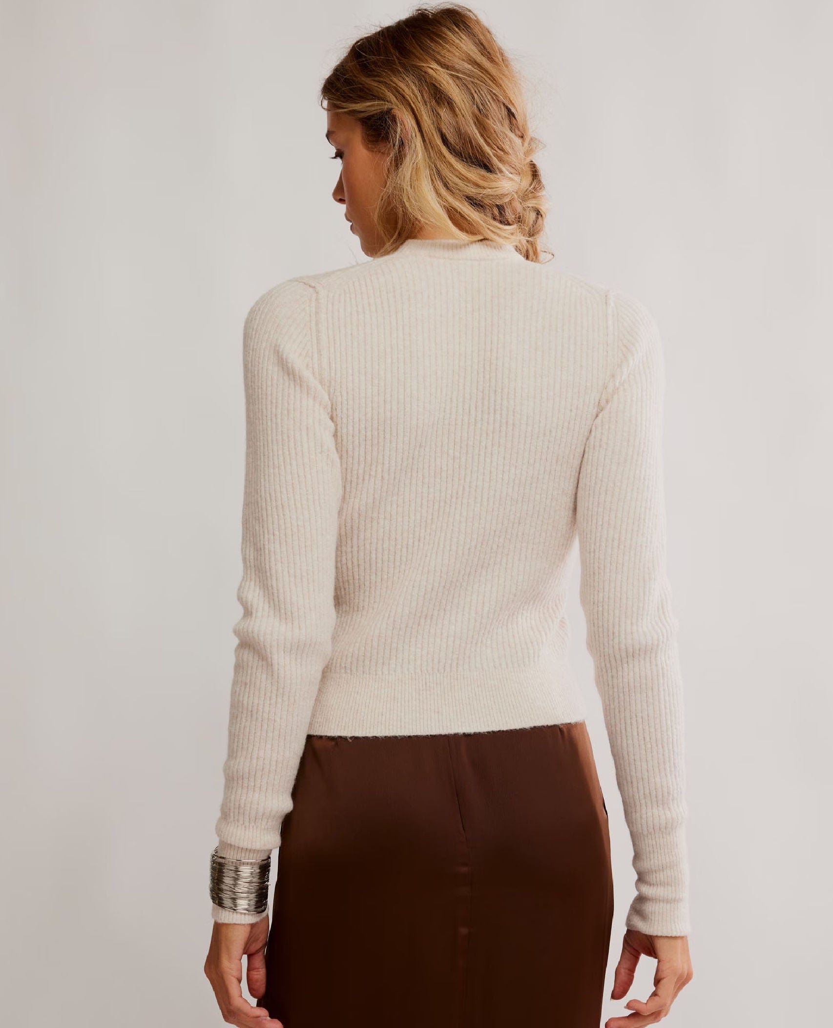 Wear it half-tucked into high-rise denim for casual, model-off-duty energy, layer it over a satin slip skirt or midi dress for an elevated twist, or pair it with tailored trousers and loafers for a polished yet cozy office-ready look. Its cropped shape makes it perfect for balancing wide-leg bottoms and high-waisted silhouettes.