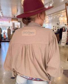 The Harvest Treasures Tunic from Jaded Gypsy is an oversized, artful layer with a relaxed boho spirit. Made in 100% cotton, this easy-fitting piece features soft gray stripes mixed with taupe and subtle black detailing, creating a lived-in, textured look. The front placket is accented with a set-in striped detail and three buttons, with matching three-button cuffs at the sleeves for an extra touch of charm.