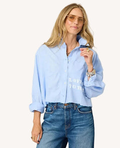 It’s joyful fashion at its best. The uplifting message, the fresh mid-blue hue, and the timeless shirt silhouette make this one feel special but easy. It’s the kind of piece that sparks compliments and feels like a little confidence boost every time you wear it.