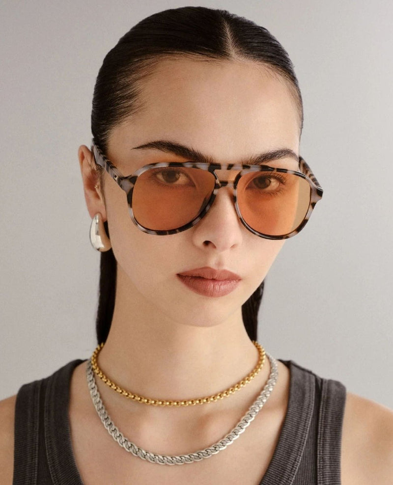 The frame is finished in a luxe tortoiseshell with amber mono-tint lenses, offering an elevated, sophisticated vibe. Made from Ecozen T110, a sustainable material derived from 10% plant biomass, these sunglasses are both lightweight and durable. The polycarbonate lenses are shatterproof, scratch-resistant, and provide Category 2 UV protection, making them both stylish and practical.