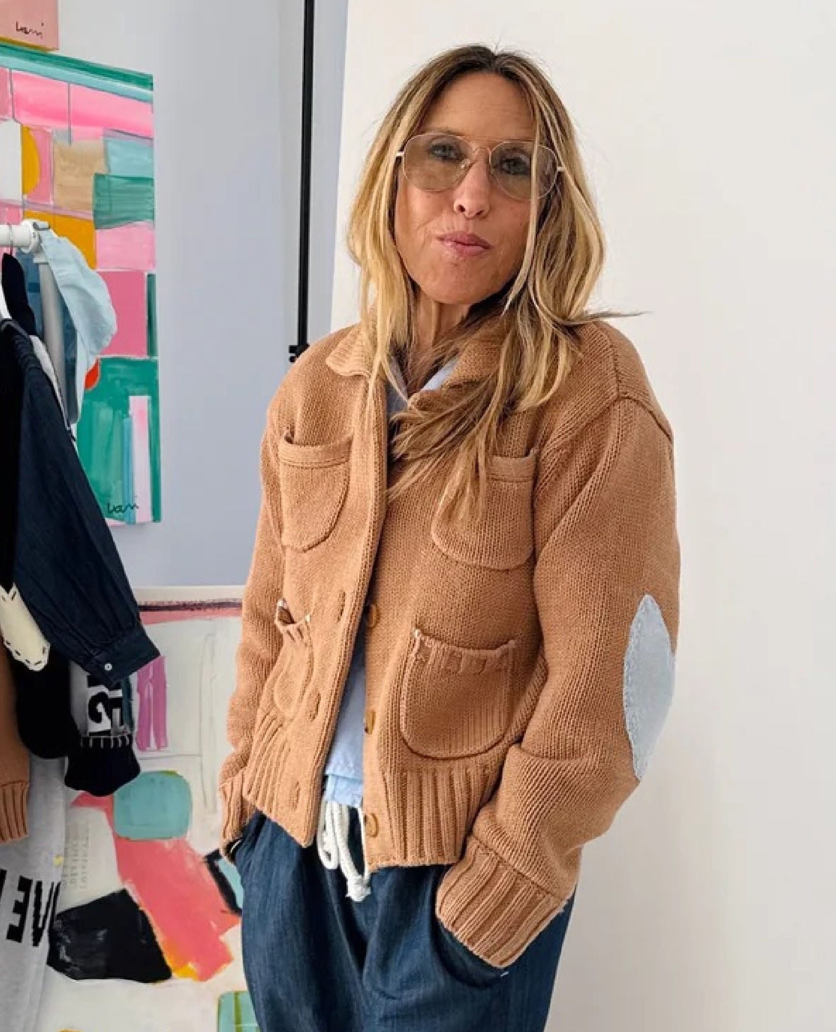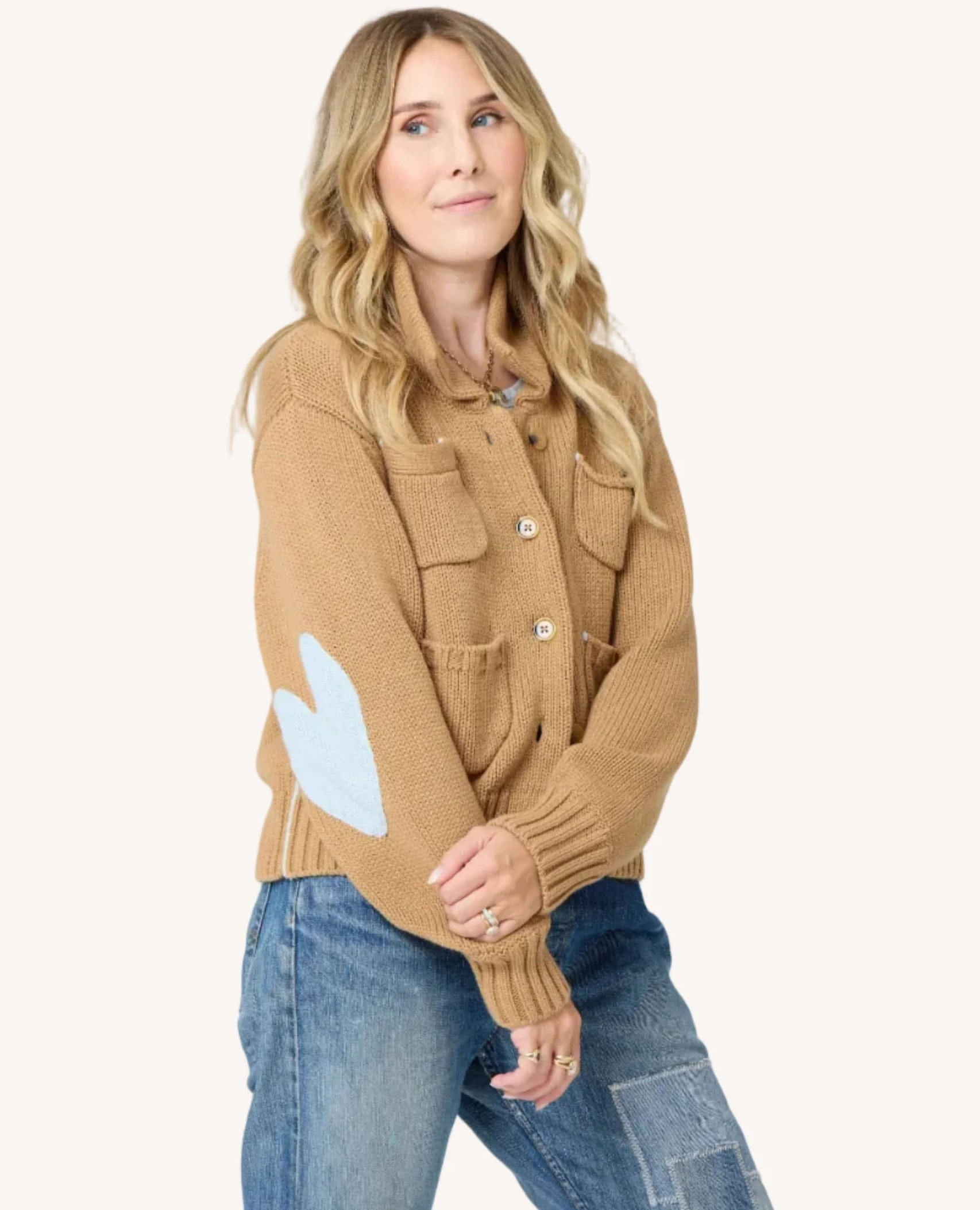 Made from 100% cotton knit, this jacket offers breathable comfort with a soft, textured hand. The contrast Imperfect Heart elbow patches add signature charm and dimension.