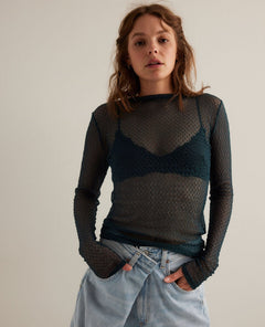 Add the perfect layer to every look with the Free People Minding My Business Top in Oil Green. Effortlessly chic and endlessly versatile, this long-sleeved top is crafted in a sheer, textured fabrication that drapes beautifully over any base — from a simple tank to a barely-there bralette. It’s that go-to piece that makes layering look easy and intentional.