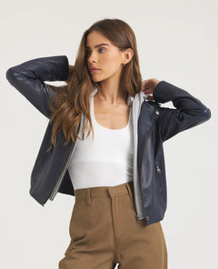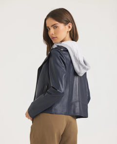 The Molly Washable Leather Jacket in Indigo blends city-chic edge with laid-back cool. Crafted from Jakett’s signature lightweight, genuine washable leather, this cropped moto features a detachable soft grey hood for an effortless layered look. The deep indigo tone gives this timeless silhouette a modern twist that pairs beautifully with both denim and neutrals.