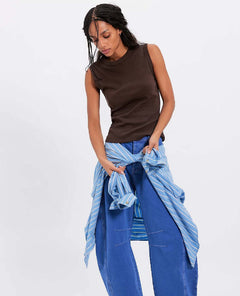 It’s that perfect intersection of basic and bold — simple enough to be a closet staple but rich enough in color and cut to feel special. The chocolaty tone works across seasons and skin tones, making everything you pair with it pop. It’s the kind of tank that feels luxe without trying too hard — understated but undeniably cool.