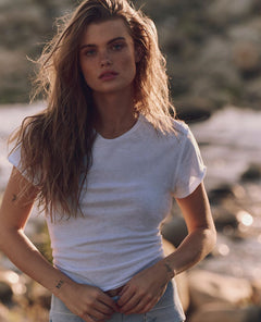 Designed with a relaxed yet slim fit, this tee hugs in all the right places without feeling tight. The crew neckline and capped sleeves give it that classic baby-tee silhouette, while raised seaming adds subtle structure and dimension. It fits true to size with a flattering, slightly cropped length that pairs perfectly with high-rise bottoms.