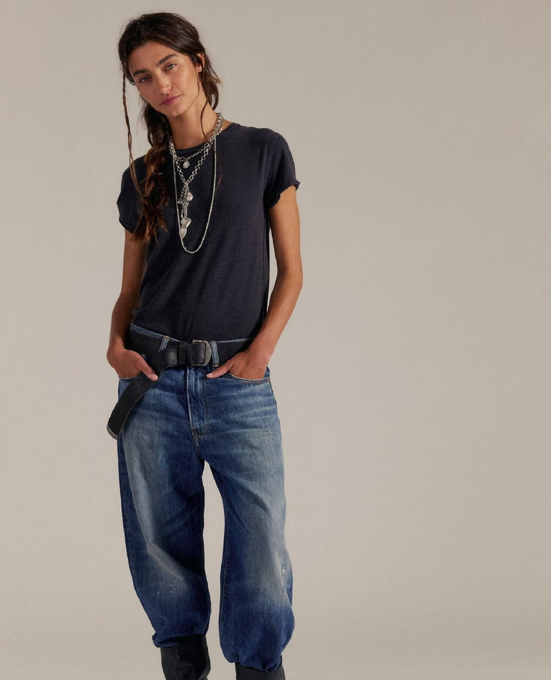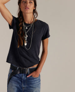 Designed with a relaxed yet slim fit, this tee hugs in all the right places without feeling tight. The crew neckline and capped sleeves give it that classic baby-tee silhouette, while raised seaming adds subtle structure and dimension. It fits true to size with a flattering, slightly cropped length that pairs perfectly with high-rise bottoms.