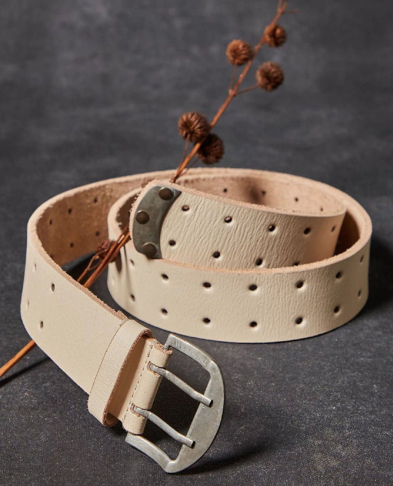 Features: Medium width, leather fabrication, metal buckle, defined holes throughout